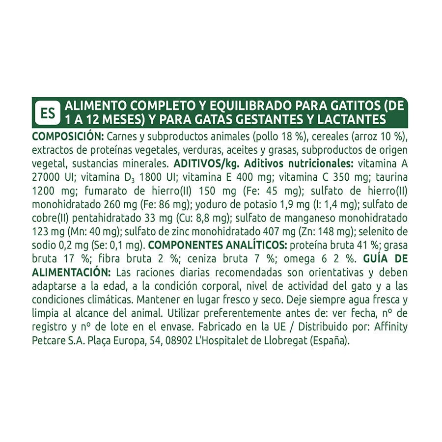 La receta incluye pollo como ingrediente principal, lo que hará las delicias de tu mascota ya que se trata de uno de los alimentos más reclamados por los felinos. Su incondicionable sabor y sus beneficiosas proteínas ayudarán a que tu mascota crezca fuerte y sana en su primer año de vida.