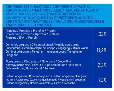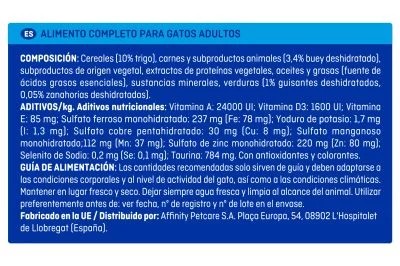 INGREDIENTES: Cereales (10% trigo, 4% maíz), carnes y subproductos animales (4% proteínas deshidratadas de buey), subproductos de origen vegetal (2,5% pulpa de remolacha), verduras (2% guisantes deshidratados, equivalente a un 7,7% de guisantes frescos, 0,05% zanahoria deshidratada, equivalente a un 0,4% de zanahoria fresca), extractos de proteínas vegetales, aceites y grasas, sustancias minerales.