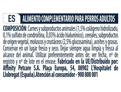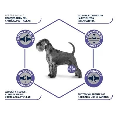 La glucosamina, la condroitina y el colágeno intervienen en el metabolismo celular y protegen activamente la estructura del cartílago frente a los signos de desgaste degenerativo. El ácido hialurónico, en combinación con los ácidos grasos omega-3, ayuda a la conservación del líquido sinovial, también llamado sinovia, lo cual contribuye al buen funcionamiento articular. Además de ello, la vitamina K influye positivamente en la formación de unos huesos fuertes. Con este suplemento nutricional puedes mimar a tu perro a la vez que cuidas de su salud.