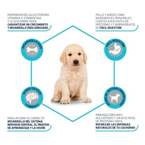 La composición incluye DHA Omega 3, que mejora el desarrollo cognitivo y el cerebral. Además incluye inulina, que tiene efecto prebiótico y mejora el desarrollo de la flora intestinal. Cuenta también con nucleótidos, que mejoran en gran medida las defensas de tu mascota.