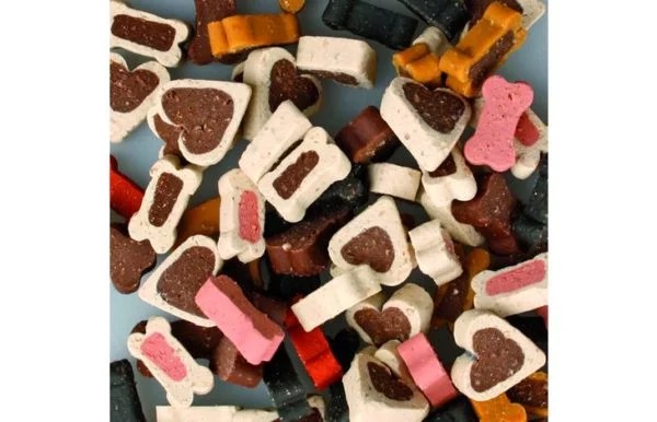 Complemento alimenticio con forma de corazoncitos y huesitos que sirve como pienso complementario para perros.