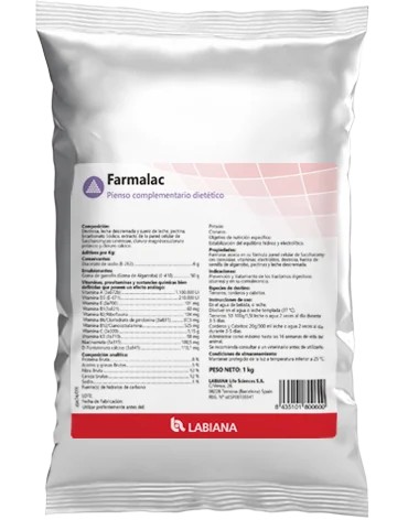 Farmalac es un producto en polvo a base de pectinas y nutrientes destinado al tratamiento complementario de las diarreas de los terneros, que contiene vitamina A, B1, B2, B6, B12, C, D, D3, E y K