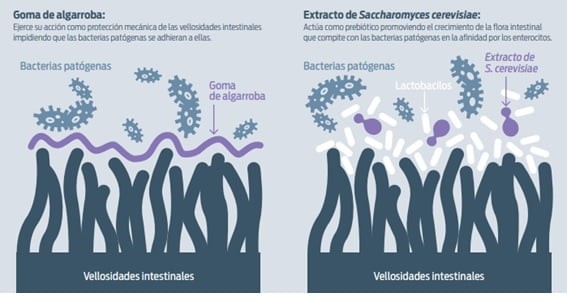 La goma de algarroba ejerce su acción como protección mecánica de las vellosidades intestinales impidiendo que las bacterias patógenas se adhieran a ellas