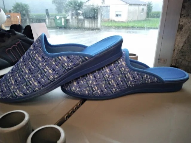 Zapatilla casa de mujer en paño. Piso de goma y cuña de 1 cm. Muy cómoda.